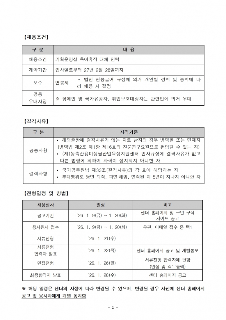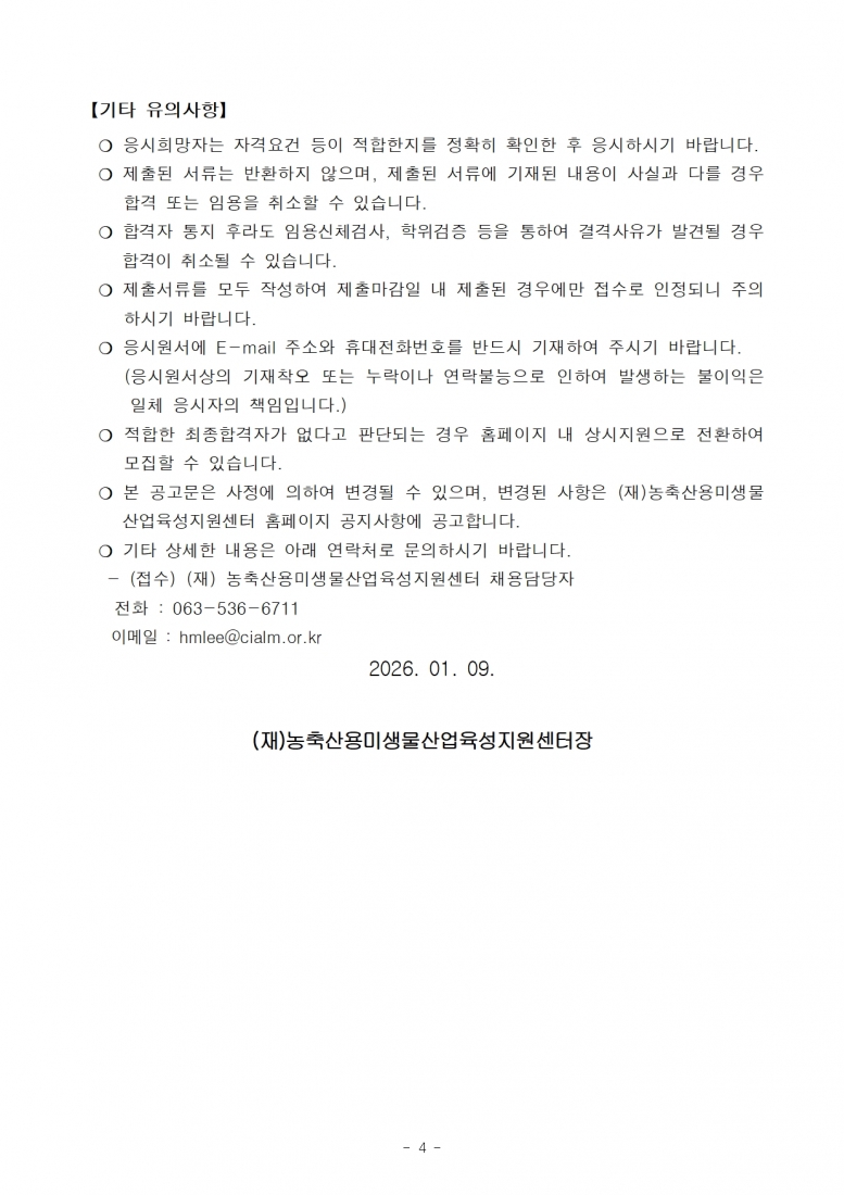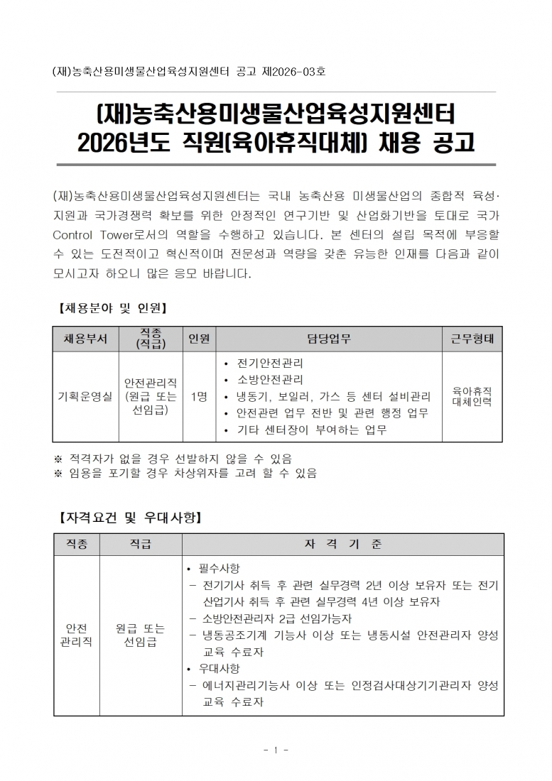 (재)농축산용미생물산업육성지원센터 2026년도 직원(육아휴직대체)채용 공고