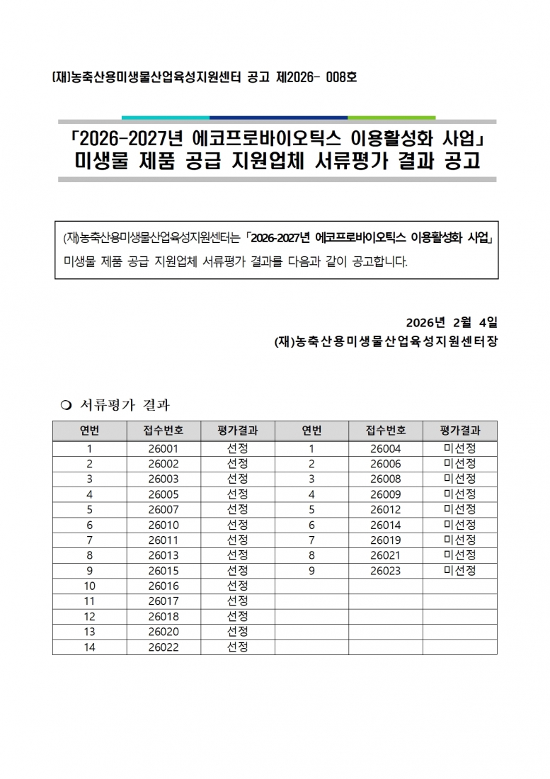 [2026-2027년 에코프로바이오틱스 이용활성화 사업] 미생물 제품 공급 지원업체 서류평가 결과 공고